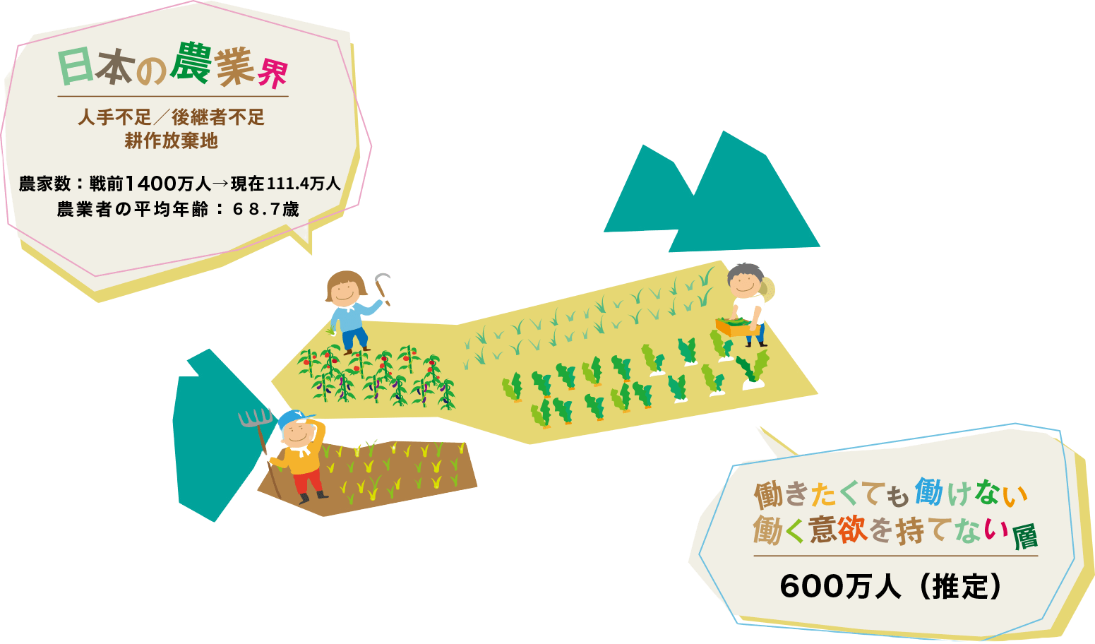 戦前1400万人ほどいた農業の担い手は、現在111.4万人まで減少し、65歳以上の方が全体の71.7%、平均年齢が68.7歳と、高齢化と人手不足で、危機的な状況に置かれています(2024年農林水産省調査)。