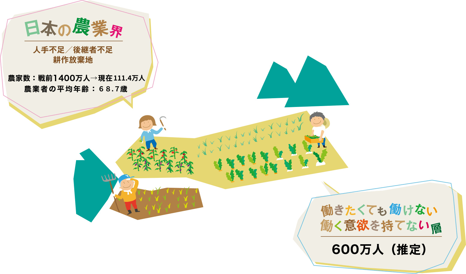 方や、働きづらさを抱える方、働きたいけど仕事がない方なども多数存在します。 日本財団の「就労困難者に関する調査研究」(2018年)によれば、ホームレスや引きこもり、障害者、ネットカフェ難民など多様な背景を持った方々を含めると、日本の就労困難者数は、約600万人に上ると推定されます。(うち広義の引きこもり状態の方は146万人:2023年内閣府調査)